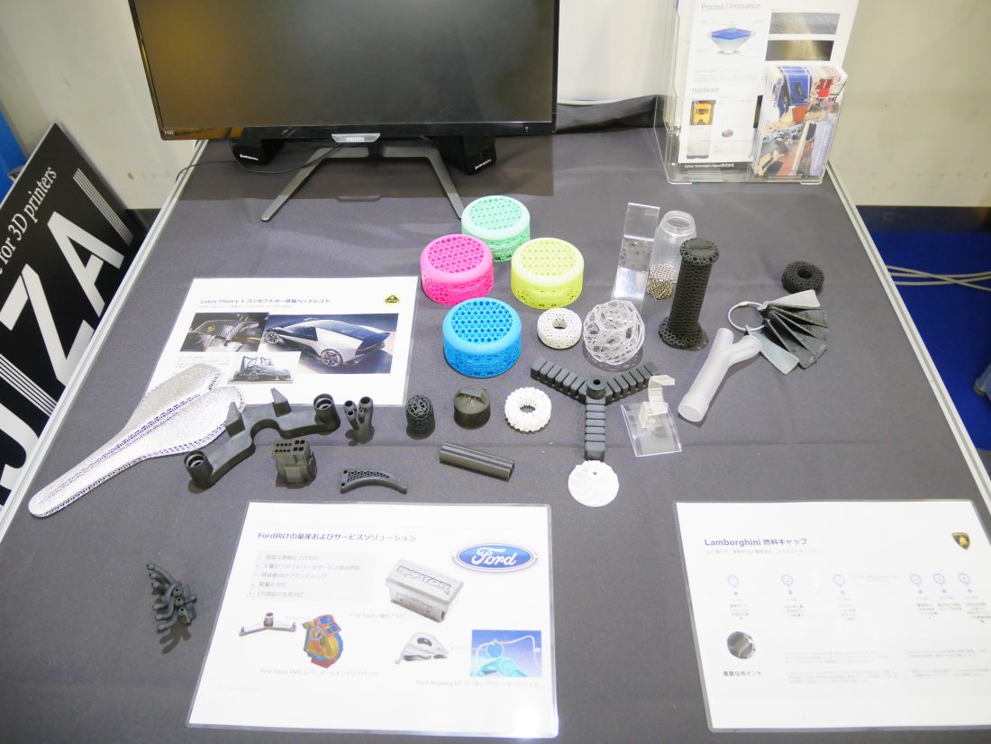 量産機として国内外で実績のあるアメリカ発の樹脂系3Dプリンタをご紹介。国内外の名だたるブランドに量産機として採用されており、量産部品の累計生産数は約400万点に達している。今回、「柔らかい材料にアルミメッキをしたサンプル」「自転車用サドル」「LotusCar用ヘッドレスト」「トヨタやデンソーで採用されているロボットハンド用部品」「Ford向けサービスパーツ」「Lamborghini向け燃料キャップ「ヘルメット用クッション」等の実用化されているサンプルを展示ご紹介。